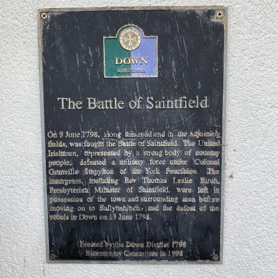 Saintfield’s heritage is closely linked to one of Ireland’s most significant uprisings — the Irish Rebellion of 1798. In 1792, the Presbyterian minister Thomas Ledlie Birch led a local branch of the Society of United Irishmen, a movement that sought parliamentary reform and collective rights for all Irish people regardless of religion.